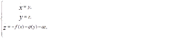 Этот предел будем называть производной функции в силу системы . Пусть функция Тогда для продолжимости всех решений системы на промежутке 1) 2) Замечание. Вместо условия 1) в теореме может быть взято условие Следствие. Если 1) 2) Продолжимость всех решений некоторых уравнений третьего порядкаПоскольку одна из целей данной дипломной работы --- показать на примере применение функций Ляпунова к исследованию продолжимости решений дифференциальных систем, мы ставим перед собой задачу применить функции Ляпунова для решения вопроса продолжимости на Рассмотрим уравнение эквивалентное системе Пусть функции а) б) функция в) функция 1) 2) тогда все решения системы неограниченно продолжаемы. Доказательство Рассмотрим функцию
