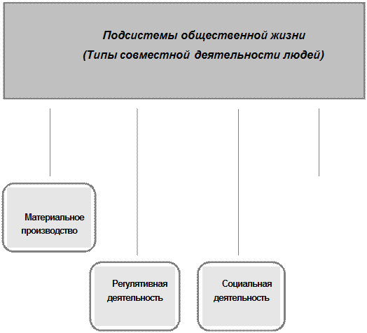 Рис. 1. Типы совместной деятельности людей Каким образом система, состоящая из многих частей, способна существовать и изменяться как единое целое, как возникают интегральные средства целого, которых лишены его части? Представители монистического течения считают, что на каждом “этаже” социальной структуры можно видеть главный системообразующий фактор, который воздействует на все прочие явления (т.е. части системы находятся в субординационной зависимости). Сторонники плюралистического направления убеждены в том, что части любой общественной единицы, находятся между собой в координационной зависимости: взаимно влияя друг на друга, они не разделяются на определяющие и определяемые. Также различные точки зрения на эту проблему у материалистов (К. Маркс) и идеалистов (П. Сорокин). “Интегральная концепция” П. Сорокина исходит из идеи безусловного сознания в общественной жизни людей, характер социальных предметов и процессов определяется идеями, целями, а не вещественно–энергетическими средствами, используемыми для их воплощения. Духовное всецело определяет материальное в жизни общества. Рассуждая о строении общества, Сорокин выдвигает два уровня организации: уровень культурных систем (совокупность взаимосвязанных идей) и уровень собственно социальных систем (совокупность взаимосвязанных людей). Причем второй уровень всецело подчиняется первому. Сорокин различает отношения субординации между культурным и материальным уровнями и отношения координации (взаимовлияния) между важнейшими составляющими Культуры. В истории существуют, попеременно сменяя два основных вида мировоззрения – “духовный ” и “чувственный”, каждому из которых соответствует свой тип общественного устройства (“социокультурная суперсистема”). Люди, которые живут в обществах первого типа, исходят из убеждения в том, что окружающая их реальность имеет духовное, божественное происхождение. Соответственно смысл своего существования они видят в подчинении божественному абсолюту, с презрением или снисхождением относясь ко всему мирскому, переходящему. Поэтому материальное производство в таких обществах имеет по существу поддерживающий характер. Основным объектом воздействия считается не природа, а человеческая душа, которая должна стремиться к слиянию с Богом. Прямо противоположные характеристики свойственны обществам второго типа, основанным на материалистическом восприятии мира, акцентирующие чувственные стороны человеческого бытия. Наконец Сорокин допускает существование промежуточного типа социокультурной организации – идеалистического, стремящегося гармонично сочетать принципы духовности и чувственности “даже общая культура индивида (как самого маленького культурного ареала) не является полностью интегрированной в одну причинно–смысловую систему. Она представляет собой сосуществование множества культурных систем – частично гармонирующих друг с другом, частично нейтральных и частично противоположенных друг другу–плюс, сосуществование множества скоплений, каким-то образом попавших в общую культуру индивида и осевших там”. Историческое развитие человечества автор книги “Социологические теории современности” рассматривает как постоянную циклическую смену “социокультурных суперсистем”. Причину постоянной 