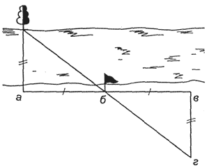 Рис. 4 Схема измерения ширины реки геометрическим способом. Расстояние «ВГ» равно ширине реки (расстоянию от точки А на одном берегу до выбранного, наблюдаемого ориентира на другом берегу) (по Вяткину Л.А. с соавт., 2001). Чтобы измерить нужный азимут длинную грань подложки компаса (указатель направления на подложке) направляют на целевой ориентир местности. При этом удерживают компас горизонтально на уровне глаз и смотрят на ориентир вдоль грани подложки. Далее вращением шкалы колбы компаса добиваются того, чтобы красная стрелка компаса указывала на значение «ноль градусов» шкалы азимутов, соответствующее направлению на север (при этом стрелка располагается внутри нанесенных на дне колбы специальных рисок указателя севера). Наконец, снимают значение нужного азимута на шкале напротив черты-риски азимутов.