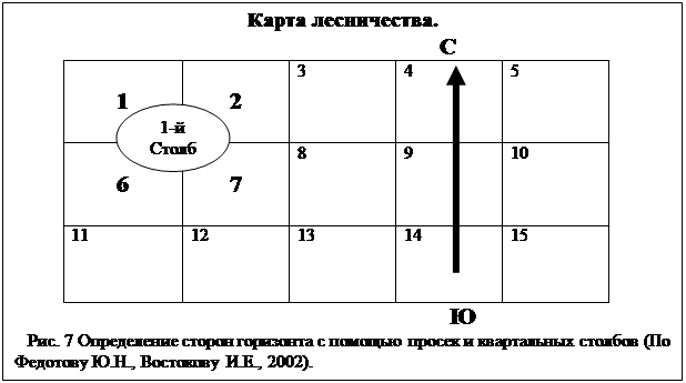 Рис. 6 Определение сторон света по солнцу и часам (см. описание в тексте). По Алешину В.М., Серебрянникову А.В., 1985) Таким образом, номера кварталов, указанные на квартальном столбе, стоящем на пересечении просек, изменяются на одну единицу с запада на восток, а резкий скачок в нумерации более чем на две единицы указывает на более южный квартал (Рис.7).