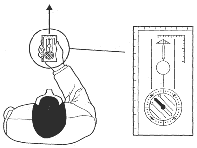 Рис. 8. Движение по точному азимуту (описание действий смотрите в тексте) (По Уилсону Н., 2004). Турист строго в указанном компасом направлении намечает для себя какой-нибудь объект (дерево, куст и т. п.). Этот объект и будет первым промежуточным ориентиром. Нужно только чтобы ориентир был достаточно заметным и не терялся из виду при приближении к нему. Дойдя до первого промежуточного ориентира, таким же порядком, по компасу определяют второй промежуточный ориентир и двигаются, пока не достигнут его. Достигнув второго промежуточного ориентира, находят себе третий ориентир и т. д. При отсутствии видимых ориентиров в направлении движения (при продолжительном движении в условиях ограниченной видимости), туристы передвигаются просто в направлении, указанному боковой гранью подложки компаса, удерживая красную стрелку между рисок указателя Севера на дне колбы компаса. 3. Измерение высот и крутизны склонов на местности. Определение точки стояния. Какими способами можно определить крутизну склонов на местности? Склоны, как Вы уже знаете из предыдущих лекций, являются характерной разновидностью естественных препятствий в походах по горной и сильно пересеченной местности. В туристской практике применяют ряд простейших способов определения их крутизны. Глазомерный способ используют в походных условиях наиболее часто. Не представляет большой трудности на глаз дать оценку крутизны склона на качественном уровне: склон пологий, средней крутизны (до 45º), крутой. Руководствуясь такими оценками, можно, к примеру, выбрать технику передвижения по склону и приемы страховки. Труднее решить задачу количественной глазомерной оценки крутизны склона. Для относительно точной количественной оценки крутизны склонов требуется специфическая тренировка. Для этого изучают и закрепляют в зрительной памяти несколько склонов известной крутизны; затем путем мысленного сравнения определяют крутизну нужного склона. В горных походах для более точного определения крутизны склона можно воспользоваться простейшим угломером. Он представляет собою жесткое основание, на котором закреплен транспортир и отвес с грузом (Рис.9). При замере углов наклона поверхности к горизонту одну из сторон основания выставляют параллельно поверхности склона и по положению отвеса относительно шкалы транспортира определяют крутизну искомого склона (Алешин, Серебренников, 1985).