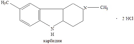 Азалептин обладает сильной нейролептической активностью в сочетании с седативными свойствами. Оказывает мышечно-расслабляющее действие, потенцирует действие снотворных и анальгетиков. Не вызывает сильного общего угнетения, свойственного другим нейролептиком. Не вызывает экстрапирадных расстройств. В некоторых случаях препарат эффективен при резистентности к лечению другими нейролептиками. 4.2.2.6. Производные индола Представителем данной группы является карбидин :