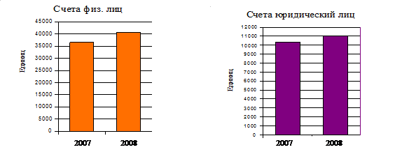 Рисунок 4. Динамика структуры и количества счетов, обслуживаемых АО «Темірбанк» Таким образом, за прошедшее время наибольшую величину, в количественном отношении, занимают счета физических лиц - 40629 тыс. ед. или 77,97% от итога 2008 г. Так же наблюдается незначительный прирост обслуживаемых счетов: юридических лиц на 673 ед. или 1,06%, физических лиц на 3978 ед. или 1,11%. При количественном росте обслуживаемых счетов их структура изменилась в незначительной степени, как показаны на рисунках 4 и 5. Перед тем как рассматривать структуру используемых расчетных документов, по нашему мнению, для выявления развития клиентской базы необходимо отдельно остановится на проблеме, связанной с неработающими счетами. Такие счета «засоряют» базу данных, усложняют труд инспекторов РКО, а также увеличивают издержки банка. Банком ведется постоянная работа, направленная на закрытие неработающих счетов. Проведем анализ динамики закрытия неработающих счетов. Данные о неработающих счетах отражены в таблице 1. Таблица 1 - Динамика и структура счетов клиентов в АО «Темірбанк»