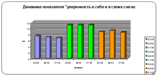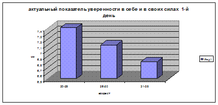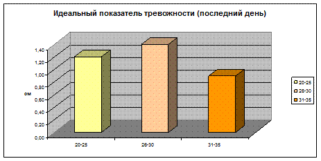 Рис.8 Показатель снижения уровня тревожности в последний день, по сравнению с первым: I группа – 0.7 II группа – 2.3 III группа – 1.6 Показатель повышения уровня уверенности в себе и в своих силах в последний день, по сравнению с первым: I группа – 1.4 II группа – 2.2 III группа – 2.0 3.2 Выводы. Уровень тревожности снизился во всех группах в последний день, (по сравнению с первым днем) а уровень уверенности в себе и в своих силах стал выше, что подтверждает гипотезу, заявленную в начале. В результате проводимого исследования были также получены данные о том, что наиболее высокий уровень тревожности наблюдается в старшей возрастной группе женщин (31-35лет), и в этой же группе показатели уверенности в себе и в своих силах ниже, чем в двух других группах. Заключение Изучение влияния релаксации на беременных женщин является актуальной темой. Нельзя преуменьшать значение релаксации ни во время беременности, ни во время родов, ни в послеродовом периоде, когда очень важно уметь расслабляться за короткое время. Анализ литературы показал, что беременность является кризисным периодом в жизни женщины. Влияние различных факторов в этот период на женщину может привести к таким серьезным нарушениям, как стресс и депрессия, которые в свою очередь могут оказать неблагоприятное воздействие на ребенка (как внутриутробно, так и после рождения). Также могут послужить «толчком» к развитию послеродовой депрессии. Умению справляться со стрессом необходимо учиться как можно раньше. Существует множество релаксационных техник, направленных на снижение тревожности и на укрепление веры в себя и свои силы. Никто кроме самой будущей мамы не сможет сказать какая из техник наиболее подходящая. Только самостоятельно «испробовав» техники – женщина сможет понять и прочувствовать какая подходит именно ей и ее ребенку. Проведенное исследование показало на примере Школы для пап и мам, что благодаря проводимым упражнениям уровень тревожности снизился, а уверенность в себе и в своих силах выросла. Необходимо проводить дальнейшую работу по изучению влияния релаксационных методик на беременных женщин т.к. владение различными методами релаксации является важным психологическим и даже психотерапевтическим инструментом преодоления кризисных состояний. Дальнейшие исследования в этом направлении, возможно, будут способствовать в будущем созданию общих методических рекомендаций для ведения курсов дородовой подготовки. СПИСОК ЛИТЕРАТУРЫ 1. Алексеев А.В. Себя преодолеть. М., Физ-ра и спорт, 1982 2. Брутман В.И., Радионова М.С. Формирование привязанности матери к ребенку в период беременности // Вопросы психологии.- 1997.-№6.- с.38-47. 3. Гроф К. Духовный кризис. Когда преобразование личности становится кризисом /Пер. с англ. А. Ригина, А. Киселева/ Общ. И научн. Ред. В.Майкова.-М.:АСТ, Изд-во Института трансперсональной психологии, Изд-во К.Кравчука, 2003. 4. Дик-Рид Г. Роды без страха, 2006 5. Копыл О.А., Баженова О.В., Баз Л.Л. Готовность к материнству // Синапс.- 1994. -№5. 6. Ланцбург М.Е. Психологическая помощь семье в период ожидания ребенка и первого года его жизни.// Психотерапия и клиническая психология: методы, обучение, организация. Мат. Росс. Конф. 26-28 мая 1999, Санкт-Петербург-Иваново, 2000.- с.312-320. 7. Ланцбург М.Е. О применении экзистенциального гуманистического подхода в психологическом консультировании береме