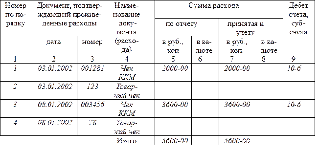 АВАНСОВЫЙ ОТЧЕТ 1 04.05.2009 Номер дата Структурное подразделение АХО Код Подотчетное лицо___Лобакин П.А. Табельный номер 333 фамилия, инициалы Приложение четыре документов на четырех листах Отчет проверен К утверждению в сумме Пять тысяч шестьсот руб 00 коп. (5600 руб. 00 коп.) сумма прописью Главный бухгалтер________________ Саркина А.А. подпись расшифровка подписи Бухгалтер_______________________ Петрова А.В. подпись расшифровка подписи Остаток внесен в сумме 400 руб. 00 коп. по кассовому ордеру Перерасход выдан № 12 от “11 ” января 2002 г. Бухгалтер (кассир)____ ____ Суханова Б.А. “ 11 ” января 2002 г. Расписка. Принят к проверке от Лобакина П.А. авансовый отчет № 1 . от “ 04 ” мая 2009 г. на сумму Пять тысяч шестьсот руб. 00 коп., количество документов 4 на четырех листах Бухгалтер Петрова А.В. (подпись) (расшифровка подписи) Оборотная сторона формы № АО-1