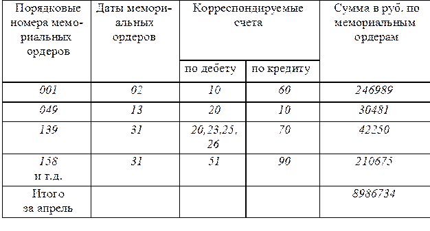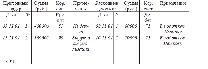 Для того чтобы получить необходимые показатели о хозяйственной деятельности, надо сведения об операциях, содержащиеся в документах, сгруппировать в соответствии с их экономическим содержанием и зарегистрировать. Такая регистрация осуществляется с помощью учетных регистров, обеспечивающих, кроме того, контроль за сохранностью документов и должностную обозримость отраженных в них данных. [5] Учетные регистры представляют собой листы бумаги, приспособленные для регистрации и группировки в них данных о наличии средств и операциях с ними, зафиксированных первичными носителями информации. Применяемые в практике бухгалтерского учета регистры можно классифицировать по внешнему виду, по объему содержания и по последовательности записей. По внешнему виду регистры бухгалтерского учета подразделяются на книги (журналы), карточки и свободные листы. Книги (журналы) представляют собой сброшюрованные листы бумаги со специальным графлением. Все страницы в бухгалтерских книгах должны быть пронумерованы и заключены в переплет. На обороте последней страницы за подписью главного (старшего) бухгалтера (или другого уполномоченного лица) делается надпись: “В настоящей книге всего пронумеровано … страниц (листов)”. Например, в настоящее время регистры в виде книг применяются для учета кассовых операций - кассовая книга (Приложение В). При большом объеме книги и значительном количестве учитываемых в ней различных объектов составляется оглавление, а в необходимых случаях – и перечень объектов в алфавитном порядке. Карточки – это отдельные таблицы на плотной бумаге. Чаще всего карточки применяются в качестве регистров аналитического учета и хранятся в картотеке. При открытии карточек их регистрируют в специальном реестре. Свободные листы представляют собой определенным образом разграфленные таблицы, предназначенные для записи хозяйственных операций. Таблицы в виде свободных листов широко используют для ведения ведомостей журналов-ордеров, машинограмм и магнитных носителей, графление регистров (книг, карточек, свободных листов) зависит от их назначения, от формы бухгалтерского учета. По объему содержания учетные регистры подразделяются на регистры синтетического и аналитического учета. Регистры аналитического учета, предназначенные для учета расчетных операций, имеют контокоррентную форму (Приложение Г). Для аналитического учета материальных ценностей служат карточки натурально-стоимостного учета (Приложение Д). По принципу группировки или последовательности записей регистры бухгалтерского учета подразделяются на хронологические, систематические и комбинированные. Хронологические регистры предназначены для записи в хронологической последовательности исходя из времени выполнения той или иной хозяйственной операции, вне зависимости от ее содержания. Задача такой регистрации – обеспечить повседневный контроль за своевременным и полным отражением в учете всех без исключения хозяйственных операций. Примером хронологического регистра может служить приведенный ранее журнал регистрации, в котором в календарной последовательности дат отражаются хозяйственные операции и обосновывающие их документы. Систематические регистры предназначены для записи в определенной группировке однородных хозяйственных операц