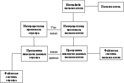 Рис. 4.1. Схема взаимодействия компонентов FTP-обмена При этом следует четко понимать, что Archie и FTP - это совершенно разные технологии. В большинстве случаев доступ к Archie-серверу пользователи осуществляют из Archie-клиента, который находится на той же машине, что и сервер, т.е. сначала пользователь по Telnet заходит как пользователь Archie, а потом использует программу-клиент (обычно она запускается в качестве оболочки) для доступа к Archie серверу. Протокол FTP (File Transfer Protocol)FTP (File Transfer Protocol или "Протокол Передачи Файлов") - один из старейших протоколов в Internet и входит в его стандарты. Обмен данными в FTP проходит по TCP-каналу. Построен обмен по технологии "клиент-сервер". На рисунке 4.2 изображена модель протокола.