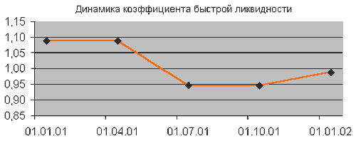 В связи с введением в действие законодательства о банкротстве, в России распространен подход, согласно которому для финансово устойчивого предприятия значение указанного коэффициента должно составлять не менее 2. В западной практике необходимый минимум по данному показателю равен 1. В течение анализируемого года коэффициент текущей ликвидности неуклонно снижался. И хотя компания ОАО "АВС" в состоянии покрыть все свои текущие обязательства за счет имеющихся оборотных средств, тенденция снижения данного показателя свидетельствует об ухудшении ликвидности фирмы. Рис 4