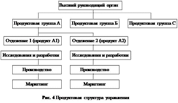 Децентрализация управления в рамках линейно-функциональной структуры приводит к тому, что разделение прав и ответственности дробится между разными органами, руководящими техническими разработками, закупкой сырья и материалов, производством, сбытом и т. д. Наиболее типичен такой процесс для предприятий, где устойчиво выпускается огромное количество однородных продуктов и экономия на масштабе производства значительна. Одним из условий децентрализации структуры может служить ситуация, когда рынок представляет собой единое целое и отличается высокой степенью концентрации потребления. Вместе с тем развитие диверсификации производства, резкое усложнение внутренних и внешних связей, динамизм внедрения технических новшеств, жесткая борьба за рынки сбыта продукции приводят к серьезным трудностям и во многих случаях совершенно исключают использование функциональных форм управления. С ростом размеров корпораций, расширением номенклатуры выпускаемых продуктов и рынков их сбыта функциональные структуры управления в силу разобщенности прав и ответственности по отдельным функциям теряют способность реагировать на происходящие изменения. В процессе управления возникают конфликты при выборе приоритетов, принятие решений задерживается, линии коммуникаций удлиняются, затрудняется осуществление контрольных функций. Построение организации по линейно-функциональному принципу (с группировкой по видам управления) показано на рис. 9.4. К этому типу относятся структуры, которые сформированы либо по продуктовому, либо по территориальному признаку. Подобные структуры чаще используют крупные диверсифицированные корпорации, выпускающие широкую номенклатуру продукции для различных рынков. Наиболее типичная для них — продуктовая структура управления , при которой центральной штаб-квартире организации подчиняются специализированные по видам продукции отделения с самостоятельной хозяйственной деятельностью. При дивизиональной структуре отделения могут быть специализированы и по рынкам сбыта. Отход от использования строго функциональных схем управления корпорациями в пользу дивизиональной структуры организации деятельности по отделениям достаточно отчетливо прослеживается с развитием диверсификации производства. Однако на практике проявляется определенная сдержанность в отношении децентрализации и устанавливаются ее допустимые пределы. Вызвано это тем, что стали отчетливо видны негативные стороны излишней свободы отделений и предприятий в выборе сфер производственной деятельности и принятии ответственных управленческих решений. Во многих случаях руководство корпораций теряет возможность контролировать производственно-хозяйственную деятельность отделений, возникают сложные информационные проблемы. Поэтому высшие руководители многих корпораций, не упраздняя отделения, получившие достаточную самостоятельность, вносят существенные поправки в их организационную структуру, подчиняя их своей власти в значительно большей степени. Дивизиональная форма может рассматриваться как соединение организационных звеньев, обслуживающих определенный рынок и управляемых централизованно. Ее логика заключается в сочетании автономности подразделений с центрально контролируемым процессом распределения ресу