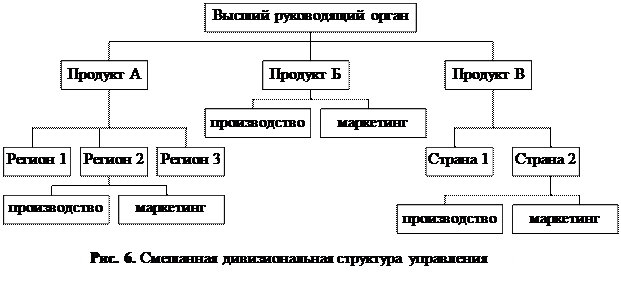 С точки зрения местных факторов использование территориальной организационной структуры приобретает некоторые дополнительные плюсы. Это вызывает создание новых рабочих мест для местного населения, не говоря уже об экономической выгоде, а именно снижении транспортных расходов, ренты, стоимости рабочей силы. Преимущества территориальной организации сбытовой деятельности заключаются в основном в экономии средств и высокой эффективности работы. Сбытовой персонал может уделять больше времени продаже товаров и сократить затраты на передвижение. Кроме того, будучи ближе к покупателям, он получает возможность изучить их потребности, рыночные предпочтения и выяснить, какая рыночная стратегия будет иметь наибольшие шансы на успех. В крупных диверсифицированных компаниях появляются дивизиональные структуры смешанного типа, сочетающие как продуктовый, так и территориальный принципы построения (рис. 6). Одна из заметных тенденций организационной перестройки предприятий в переходной экономике состоит в существенном повышении самостоятельности отдельных звеньев структур управления и создании на этой основе дочерних фирм. Вокруг крупных предприятий формируется сеть небольших мобильных фирм, способных быстро перестраиваться применительно к изменяющемуся спросу. Благодаря этому происходит приближение предприятий — производителей продукции к потребительскому сектору, ускоряется процесс реализации продукции. Из производственной и организационной структуры многих крупных предприятий выделяются подразделения, имеющие полный производственный цикл. С одной стороны, создаются самостоятельные хозяйствующие субъекты, ориентированные на определенных потребителей, а с другой — сохраняется целостность производственно-технологического комплекса, общая направленность и профиль его деятельности.