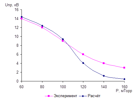 Итак: т.е. пробивное напряжение зависит от концентрации нейтралов, которая, в свою очередь, зависит от напряжения на промежутке. Будем искать пробивное напряжение, решая систему этих уравнений для нескольких Ib и P (решение в MathCAD приведено в приложении 1). Таблица 6.2. Экспериментальные и расчётные результаты.