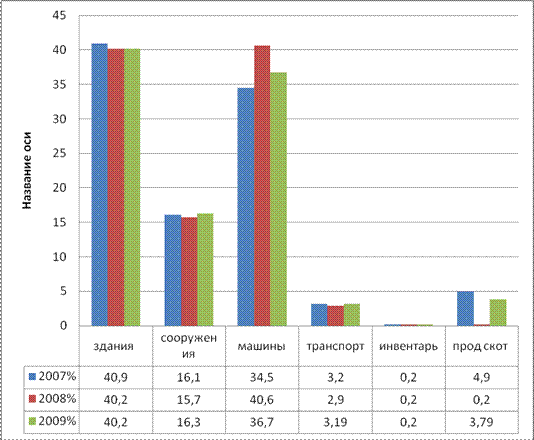 Вывод к таблице 4: структура основных средств представлена на рисунке 3.Структура основного капитала представлена в среднем на 40,2 % зданиями; сооружениями в динамике трех лет показатель колеблется от 15,7 до 16,3%; машины составляют удельный вес от 34,5% до 36,7% в 2009 году; небольшую долю занимают транспорт( от 2,9 до 3,19%), инвентарь и продуктивный скот- удельный вес которого составляет соответственно за 2007-2009гг – 4,0; 0,2;3,79%. У сельскохозяйственного предприятия должно в структуре основных фондов, преобладающим быть транспортное оборудование, машины, сооружения - если предприятие занимается переработкой и производством. На данном предприятии, оснащенность транспортными средствами желает быть лучшего.