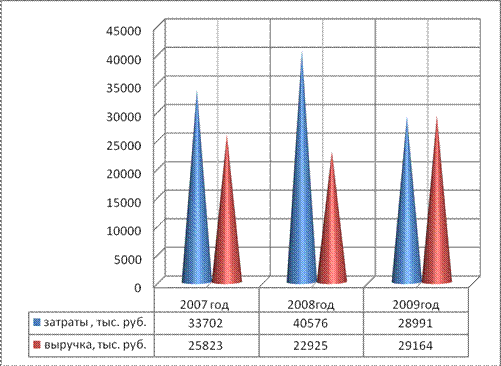 Рисунок 2 – Выручка и затраты СПК «им. Черняховского» Таблица 8 - Показатели эффективности деятельности СПК «им. Черняховского» за 2007-2009гг.