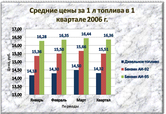 Аналогично получаем шаблоны выходных документов: «Ведомость затрат на приобретение ГСМ за февраль 2006 г.» «Ведомость затрат на приобретение ГСМ за март 2006 г.» «Ведомость затрат на приобретение ГСМ за квартал 2006 г.» 13. С помощью Мастера диаграмм в MSExcel построим гистограмму средней цены 1 л топлива по каждому месяцу и по каждому виду топлива: