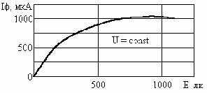 При освещении фоторезистора энергия фотонов расходуется на перевод электронов в зону проводимости. Количество свободных электронно-дырочных пар возрастает, сопротивление фоторезистора падает и через него течет световой ток Iс= E / (Rс + Rн). (2.5) Разность между световым и темновым током дает значение тока Iф, получившего название первичного фототока проводимости Iф=Iс – Iт. (2.6) Когда лучистый поток мал, первичный фототок проводимости практически безынерционен и изменяется прямо пропорционально величине лучистого потока, падающего на фоторезистор. По мере возрастания величины лучистого потока увеличивается число электронов проводимости. Двигаясь внутри вещества, электроны сталкиваются с атомами, ионизируют их и создают дополнительный поток электрических зарядов, получивший название вторичного фототока проводимости. Увеличение числа ионизированных атомов тормозит движение электронов проводимости. В результате этого изменения фототока запаздывают во времени относительно изменений светового потока, что определяет некоторую инерционность фоторезистора. К основным характеристикам фоторезисторов относятся: - вольтамперная, характеризующая зависимость фототока (при постоянном световом потоке Ф) или темнового тока от приложенного напряжения. (рис.2.4 ). Закон Ома нарушается в большинстве случаев только при высоких напряжениях на фоторезисторе. Эта характеристика линейна в довольно широких пределах. Для некоторых типов фоторезисторов при напряжениях меньше рабочего наблюдается нелинейность. Световая (люксамперная), характеризующая зависимость фототока от падающего светового потока постоянного спектрального состава. Полупроводниковые фоторезисторы имеют нелинейную люксамперную характеристику (рис.2.5). Наибольшая чувствительность получается при малых освещенностях. Это позволяет использовать фоторезисторы для измерения очень малых интенсивностей излучения. При увеличении освещенности световой ток растет примерно пропорционально корню квадратному из освещенности. Наклон люкс амперной характеристики зависит от приложенного к фоторезистору напряжения.