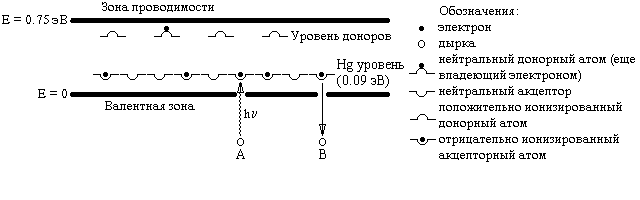 Рисунок 2.9 - Типовая схема включения детектора с фотосопротивлением Полупроводниковый кристалл последовательно соединен с резистором R и источником постоянного напряжения V. Оптическая волна, которую нужно зарегистрировать, падает на кристалл и поглощается им, возбуждая при этом электроны в зону проводимости (или в полупроводниках p-типа – дырки в валентную зону). Такое возбуждение приводит к уменьшению сопротивления Rd полупроводникового кристалла и, следовательно, к увеличению падения напряжения на сопротивлении R, которое при DRd / Rd << 1 пропорционально плотности падающего потока. В качестве примера рассмотрим энергетические уровни одного из наиболее распространенных полупроводников – германия, легированного атомами ртути. Атомы Hg в германии являются акцепторами с энергией ионизации 0.09 эВ. Следовательно, для того, чтобы поднять электрон с верхнего уровня валентной зоны и чтобы атом Hg (акцептор) сумел захватить его, необходим фотон с энергией, по крайней мере, 0.09 эВ (т. е. фотон с длиной волны короче 14 мкм). Обычно кристалл германия содержит небольшое количество ND донорных атомов, которым при низких температурах энергетически выгодно отдавать свои валентные электроны большому количеству NA акцепторных атомов. При этом возникает равное количество положительно ионизированных донорных и отрицательно ионизированных акцепторных атомов. Так как концентрация акцепторов NA >> ND, большинство атомов-акцепторов остается незаряженным. Падающий фотон поглощается и переводит электрон из валентной зоны на уровень атома-акцептора, как это показано на рис. 2.10 (процесс А).
