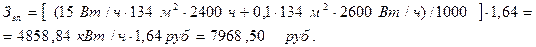 рассчитываются, исходя из нормы амортизации – 1,2% от стоимости части здания (площади), относящейся к данному участку. Из таблицы 8 капитальные затраты на производственную площадь составляют 402 тыс. руб. Тогда Затраты на содержание зданий, сооружений, инвентаря включают затраты на освещение, отопление, воду для бытовых нужд, затраты на вспомогательные материалы, а так же затраты по содержанию инвентаря. При расчете затрат на электроэнергию используем следующие данные: средний расход электроэнергии в течение 1 часа составляет 15 Вт на 1 кв. м. площади, годовое число часов осветительной нагрузки при двусменной работе равняется 2400 часов. Кроме этого, в год на 1 кв.м. дежурного освещения (примем равным 10% от общей площади участка) расходуется дополнительно 2600 Вт/час. Общая площадь участка (см. п. 3.1) равняется 134 кв.м.