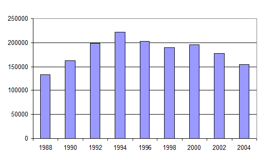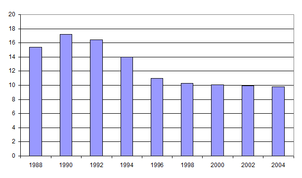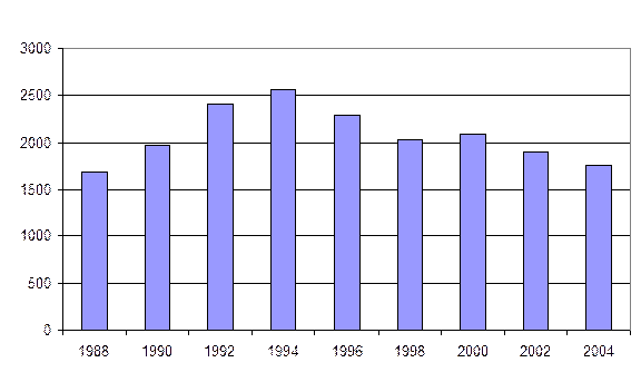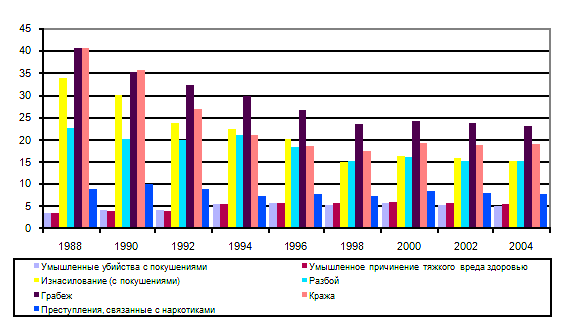 Рисунок 3. Доля преступлений, совершенных несовершеннолетними в России в общей преступности, % Как явствует из приведенных данных, количество зарегистрированных в России преступлений, совершенных несовершеннолетними или с их участием, выросло с 1987 г. по 1998 г. в 1,6 раза (по сравнению с 2004 г. — в 1,16 раза), уровень этих преступлений за 1988 – 2004 гг. вырос в 1,04 раза (уровень в 1988 – 1994 гг. вырос 1,5), тогда как в общем количестве преступлений сократилась на 36,4%. Последнее обстоятельство объясняется тем, что темпы роста преступности несовершеннолетних были существенно ниже темпов роста всей преступности (с 1988 по 2004 г. количество и уровень всех преступлений выросло в 2,5 раза). Характеристика отдельных видов преступлений, совершенных несовершеннолетними или с их соучастием, представлена в таблице 3 (См. в Приложении). По данным таблицы 3 построим рисунок 4.
