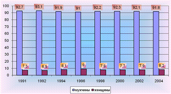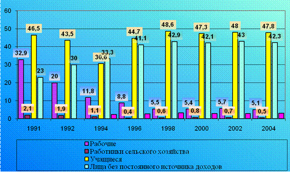 Рисунок 8. Доля несовершеннолетних, совершивших преступления по роду занятий Из приведенных данных можно сделать вывод о том, что доля девушек среди несовершеннолетних преступников в России относительно стабильна — 7-9% без выраженной тенденции (доля женщин среди преступников всех возрастов 11-15%). Доля 14-15-летних среди несовершеннолетних преступников в России - 32,8% в начале 90-х гг. и 28-30% - в начале 21 века. Их криминальная активность, разумеется, ниже, чем 16-17-летних. Доля рабочих и работников сельского хозяйства среди подростков, так же как и среди всех лиц, совершивших преступления, неуклонно снижается, что легко объяснить сокращением этих категорий в населении страны. Доля же лиц, не имеющих постоянного источника доходов, выросла с 1991 по 2004 г. с 23 до 42,3%. Таким образом, около половины подростков, совершивших преступления в конце 90-х гг. относятся к числу «исключенных». В юридической литературе часто указывается на взаимосвязь образовательного уровня и личности преступника. По этому признаку можно судить о потенциальных возможностях личности несовершеннолетнего правонарушителя в исполнении им своих социальных функций, зависящих в определенной степени от уровня его культуры, интересов. Говоря об уровне образования несовершеннолетних преступников, надо заметить, что он более низкий, чем у сверстников. Принципиально различается распространенность преступлений в группах несовершеннолетних, выделенныхпо роду занятий: среди учащихся школ она ниже примерно в 3,5 — 4 раза, чем среди обучающихся в ПТУ; примерно в 10 раз — чем среди работающих несовершеннолетних. Наивысшей преступной активностью характеризуется группа неработающих и неучащихся, где преступления совершаются примерно каждым пятым. «Вклад» этой группы в преступность несовершеннолетних в настоящее время уже превысил соответствующий показатель не занятых общественно полезной деятельностью в преступности в целом[40] . Исследования экспертов[41] показывают, что именно неработающие и неучащиеся подростки обычно связаны с криминальной средой; ими совершается значительная часть тяжких, предумышленных преступлений несовершеннолетних; признанные до достижения 18 лет хроническими алкоголиками и наркоманами лица. как правило, нигде не работали и не учились. Вероятно, именно криминологический аспект проблемы незанятости несовершеннолетних способен привлечь к ней в ближайшее время серьезное внимание общества. Сегодня же можно отметить чрезвычайно высокую латентность, практическое отсутствие взаимного обмена информацией по этому вопросу между субъектами воспитания и профилактики, низкую эффективность мер социальной помощи, контроля и предупреждения правонарушений среди неучащихся и неработающих подростков. Совершившие преступления несовершеннолетние проживают, как правило, в родительской семье. Сузившаяся в последние годы практика переезда подростков в крупные населенные пункты для учебы в ПТУ и работы в профилактическом отношении положительна. Индивидуальная миграция несовершеннолетних снижает возможности воспитательного воздействия, социальный контроль, повышает риск негативных влияний на личность и поведение. Соответственно знание субъектами профилактики особенностей семейной ситуации подростков-правонарушителей, воспитательных возможностей се