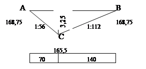 Рисунок 6.1 Канава 6.2 Левая канава Данные: коэффициент откоса- 3; уклон местности- 30 %0; грунт- глины. Находим часовую интенсивность ливня и водосборную площадь канавы ач = 0,70 мм F= 0,05 км2 Находим расход (формула 6.1) Q= 87,5*0,70*0,05= 3,1 м3 /с По таблице 2, страница 7 Vдоп = 0,85 м/с Определяем площадь живого сечения (формула 6.2) w= 3,1/0,85= 3,7 м2 Определяем глубину и ширину канавы (формулы 6.3 и 6.4)