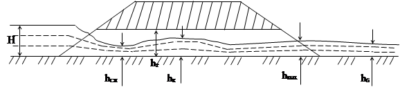 Рисунок 4.3 Напорный режим протекания воды в дорожных трубах По таблице 2, страница 8 выводим соотношение S= Н/d= 2,47/1= 2,47>1,4- условие выполнено. Находим скорость течения воды V= 2,7 м/с Определяем по формуле 4.14 iw = Q2 /wт 2 Ст 2 Rт = 2,52 /0,3322 *622 *0,25= 0,059>0,004 i0 <iw - следовательно условие соблюдается. Определяем величину подпора воды Н= Нзад +L(iw - i0 )= 2,47+24(0,059-0,004)= 3,79 м (4.16) Определяем скорость на выходе при Е = 0,6…0,9 Vвых = Q/Е wт = 2,5/0,9*0,332= 8,3 м/с (4.17) Вывод: По показателям скорости на выходе и укрепления русла трубы выбираем безнапорный режим, как более экономичный. 14 5 ГИДРАВЛИЧЕСКИЙ РАСЧЕТ ФИЛЬТРУЮЩЕЙ НАСЫПИ (насыпь напорная) Дано: i0 = 0,004; Qр = 2,5 м3 /с; грунт- глины; В= 8; m= 1,5; дорожный строительный материал- камень круглый Æ 40 см