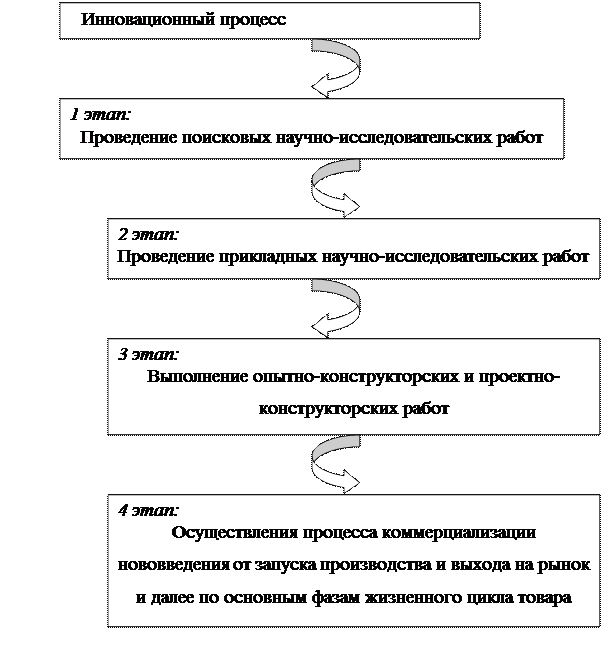В ходе первого этапа происходит выдвижение научно-технических идей. Завершаются научно-исследовательские работы обновлением и экспериментальной проверкой новых методов удовлетворения общественных потребностей. На втором этапе выполнение прикладных научно-исследовательских работ связано с высокой вероятностью получения отрицательных результатов, поэтому возникает риск потерь при вложении средств в проведении прикладных НИР. На третьем этапе выполняются опытно-конструкторские и проектно-конструкторские работы, связанные с разработкой аванпроектов (Аванпроект - это полный проект системы на уровне система / подсистема; обычно на этом этапе требуется лишь ограниченное число испытаний. В дополнение к спецификации функций и задач рассматриваются альтернативные концепции проекта, разрабатываются и рецензируются предварительные чертежи оборудования и описания рабочих процессов. В детальном проекте чертежи аванпроекта делаются более подробными, пересматриваются и доводятся до уровня компонентов), эскизно-техническим проектированием, выпуском рабочей конструкторской документации, изготовлением и испытанием опытных образцов. На четвертом этапе при запуске в производство требуются крупные инвестиции для реконструкции производственных мощностей, подготовки персонала и др. На этом этапе инновационного процесса реакция рынка на нововведения ещё не известна и риски отторжения предлагаемого товара весьма вероятны. На финансирование работ на четвертом этапе, связанных с освоением масштабного производства нового товара и последующее совершенствование технологии за счет нововведений-процессов, потребуется в 6-8 раз больше затрат, чем на расходы, связанные с исследованиями и разработками. Учитывая большие затраты на освоение масштабного производства на данном этапе инновационного процесса проводится эмиссия ценных бумаг, она позволят привлечь дополнительные инвестиции. Финансирование работ по четвертому этапу инновационного процесса может привести к организации технического освоения неконкурентоспособного продукта, если ничего кардинально нового не будет создано на предыдущих трех этапах. Четвертый этап инновационного процесса можно рассматривать как инвестиционный проект, потому как он совпадает со второй фазой жизненного цикла продукции. С другой стороны, если новшества, созданные на первых трёх этапах инновационного процесса, позволяют организовать технологическое освоение и коммерциализацию новой продукции, немеющей зарубежных аналогов, то государство принимает частичное участие в финансирование этих работ. Инновационный процесс складывается из взаимосвязанных и взаимообусловленных отдельных элементов, которые образуют единое комплексное целое. Результатом этого процесса является инновация как реализованное, использованное изменение. Инновационная деятельность - это, прежде всего, интеллектуальная деятельность, и как много видов этой деятельности, так может быть много форм проявлений инноваций. Инновационная деятельность связана с привлечением различных ресурсов. Основными из них являются инвестиции и затраты времени как на проведение исследований и разработок, так и на выполнение проектно-технологических и других работ, связанных с масштабным освоением производства новой про