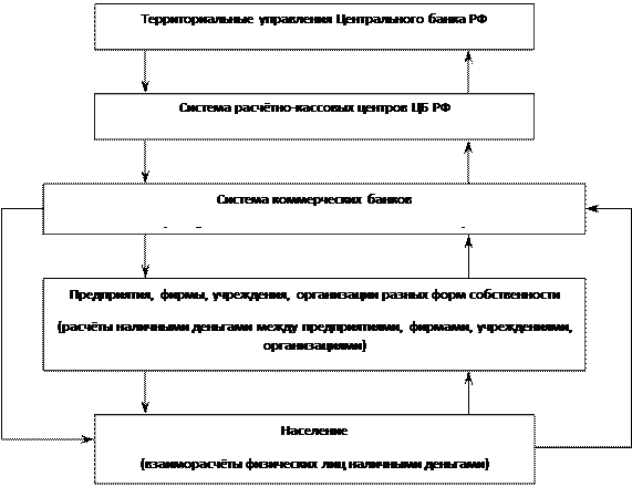 Рис. 1. Налично-денежного обращения в России Из схемы видно, что налично-денежное обращение начинается в расчётно-кассовых центрах Центрального банка РФ. Наличные деньги переводятся из их резервных фондов в оборотные кассы, тем самым они поступают в обращение. Из оборотных касс РКЦ наличные деньги направляются в операционные кассы коммерческих банков. Часть этих денег банки могут передавать друг другу на платной основе, но большая часть наличных денег выдается клиентам – юридическим и физическим лицам (либо в кассы предприятий и организаций, либо непосредственно населению). Часть наличных денег, находящихся в кассах предприятий и организаций, используется для расчетов между ними, но большая часть передается населению в виде различных видов денежных доходов (заработной платы, пенсий и пособий, стипендий, страховых возмещений, выплаты дивидендов, поступлений от продажи ценных бумаг и т.д.). [5,94] Следовательно, наличные деньги трансформируются из безналичных, которые находятся на счетах в коммерческих банках. При эмиссии безналичных денег в результате действия банковского мультипликатора происходит и эмиссия наличных денег. 2. Анализ функционирования денежного оборота и денежного обращения в России 2.1. Структура наличной денежной массы в обращении Денежная масса — весь объём выпущенных в обращение бумажных денежных знаков и металлических монет, денежные средства на текущих счетах в банках. В статистических отчётах зачастую выделяется особо из общего объёма денежных средств в хозяйственном обороте сумма наличных денег. Денежные агрегаты — виды денег и денежных средств, отличающиеся друг от друга степенью ликвидности (возможностью быстрого превращения в наличные деньги). Являются показателями структуры денежной массы и формируются из различных частей денежного обращения. Представляют собой иерархическую систему — каждый последующий агрегат включает в свой состав предыдущий: - М0 — наличные деньги (применяется в странах СНГ, слабо распространён в мире); - М1 — наличные деньги, чеки, вклады до востребования на текущих счетах; - М2 — наличные деньги, чеки, вклады до востребования и небольшие срочные вклады, вклады на сберегательных счетах; - М3 — наличные деньги, чеки, вклады, депозитные сертификаты, облигации государственного займа, казначейские сберегательные облигации, коммерческие бумаги; - M4 — M3 + неденежные ликвидные активы, хранящиеся в банковских сейфах. - L — наличные деньги, чеки, вклады, ценные бумаги, все предыдущие агрегаты включаются в L. В разных странах выделяются денежные агрегаты разного состава. В России на 01.12.2008 денежный агрегат М2 составил 13 трлн. 226,2 млрд. руб.[1] По итогам девяти месяцев (январь-сентябрь) 2008 г. денежная масса М2увеличилась на 8,3%, тогда как за аналогичный период 2007 г. ее рост составил 27,8%. Темпы прироста М2 в годовом выражении снизились с 47,5% на 1.01.2008 до 25,1% на 1.10.2008 (48,3% на 1.10.2007). В январе—сентябре соотношение темпов роста потребительских цен и денежного агрегата М2 обусловило сокращение рублевой денежной массы в реальном выражении на 2,1%, тогда как в аналогичный период 2007 г. она увеличилась на 18,7%. Таблица 1.