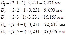 9. Задаемся кратностью шага скрутки по каждому повиву (центральная проволока считается за повив), например, m2 =16, m3 =15, m4 =14, m5 =13. 10. Вычисляем диаметр по каждому повиву: 11.
