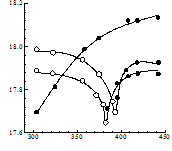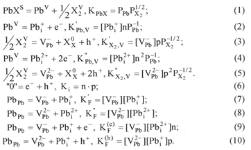 Здесь реакция (1) описывает разложение соединения в твердой фазе при температуре отжига Т; реакции (2) -(5) – переход металла и халькогена из газообразной фазы в твердую с образованием в ней соответствующих ионизированных дефектов; реакция (6) – собственную проводимость; реакции (7) -(10) – образование пар Френкеля. Система этих уравнений вместе с уравнениями полной электронейтральности (11) дают возможность найти зависимость концентрации дефектов и холловскую концентрацию носителей nH