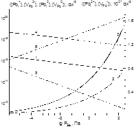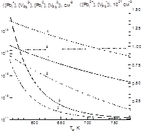 Несколько другая ситуация в термодинамическом равновесии дефектов кристаллической решетки при осаждении пленок. Здесь степень разложения соединения на компоненты определяет температура основного источника (Tе ), а равновесие в твердой фазе (конденсатой) температура осаждения (Ts ). Парциальное давление пара компонентов задается температурой дополнительного источника. Зависимости разных типов дефектов для пленок PbSe от парциального давления пара халькогена и температуры осаждения представлена на рис. 3.