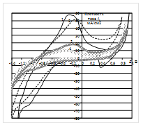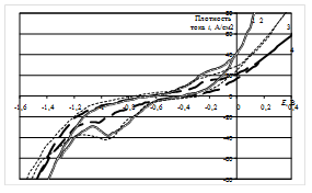 На рис. 1 представлены потенциодинамические iE - кривые для образцов с покрытиями на основе системы Ti−Cr−N в 3% NaCl и 1 М NaON растворах. Электрохимическое поведение исследуемых образцов в растворе 3% NaCl имеет подобный характер в 1М Н2 SO4 , но для циклических вольтамперометрических iE - кривых в растворе 3% NaCl наблюдается гистерезис, который обусловлен накоплением продуктов анодного растворения в порах покрытия. В катодной области при потенциалах отрицательнее -0,4 В возможно восстановление ионов железа на предельном токе. Электрохимическое поведение образцов с покрытием на основе системы Тi-Cr-N в 1 М NaON (рис. 1,б) существенно отличается от поведения в растворе 3% NaCl. Электрокаталитическая активность в кислородной области близка для стали и образцов с покрытиями. Однако для стали Ст3 при обратном ходе развертки в области потенциалов от 0,3 до 0,6 В наблюдается ярко выраженный пик, соответствующий десорбции кислорода и восстановления окисленной поверхности. В водородной области наибольшую электрокаталитическую активность проявляет сталь, наименьшую – образец с покрытием, полученным при опорном напряжении 230 В. На анодной ветви iE – кривой в области потенциалов от -0,85 до +0,1 В для стали Ст3 и образца с покрытием, полученным в отсутствии опорного напряжения, большие анодные токи обусловлены десорбцией адсорбированного и поглощенного водорода. Сопротивление сформированных покрытий коррозионному процессу определялось на основе iE – кривых. Установлено, что скорость анодного растворения основы уменьшается, и сопротивление коррозионному процессу увеличивается для покрытий, сформированных при повышенных опорных напряжениях, по сравнению со сталью (табл. 2).