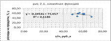 Коэффициент Фишера показывает, что это уравнение не имеет экономического смысла, так как Fфакт.< Fтабл. Полученное значение Fфакт. Указывает на необходимость принять нулевую гипотезу о случайной природу выявленной зависимости и статистической незначимости параметров уравнения и показателей тесноты связи. Графическое представление полученных результатов показано на рис. 2.1.