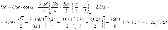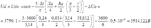 Точное выражение внешней характеристики схемы во втором (нормальном) режиме с учётом активных сопротивлений и падений напряжения в вентилях будет выглядеть следующим образом: При a=0°
