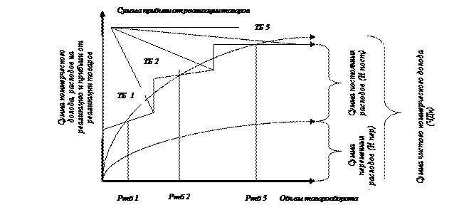 где Цет – цена единицы реализуемых товаров. 2. Определение объема товарооборота, обеспечивающего безубыточную торгово-операционную деятельность в длительном периоде. Торгово-операционная деятельность в длительном периоде по сравнению с коротким периодом претерпевает следующие основные изменения: а) с ростом объема товарооборота периодически возрастают постоянные расходы на реализацию. Это связано с увеличением парка используемых машин и оборудования (что приводит к росту амортизационных отчислений), повышение численности работников аппарата управления (что приводит к росту расходов на его содержание); б) с насыщением потребительского рынка в результате роста объема реализации товаров торговая организация вынуждена снижать уровень цен, что приводит к соответствующему уменьшению темпов роста чистого дохода; в) за счет более экономного использования материальных ресурсов, роста производительности труда операционного персонала, укрупнения партий закупаемых товаров постепенно снижается уровень переменных расходов на единицу товарооборота. Все эти изменения в силу взаимосвязи рассмотренных факторов с прибылью от реализации товаров существенно влияют на формирование ее суммы. Это можно проследить по данным графика, представленного на (рис. 1.3):