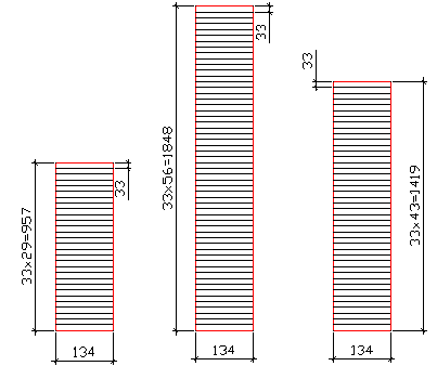 =33х43=1419 мм. Ширину сечения балки, которую принимают по условию Таким образом, согласно выше сказанному следовало бы принять ширину сечения балки 250 мм. Однако в ходе расчетов было выяснено, что подобная ширина дает колоссальный запас по прочности и применение такого сечения экономически не выгодно и неоправданно. После нескольких итераций была подобрана оптимальная ширина в 134 мм. Принимаем черновую доску 150 х 40 мм. В чистоте доска имеет размеры 134 х 33 мм. Для этого делается острожка по кромкам по 8 мм с каждой и по пласти по 3,5 мм с каждой. Следует отметить, что для экономии дорогой древесины I сорта сечение разбивают на слои сортности согласно схеме.