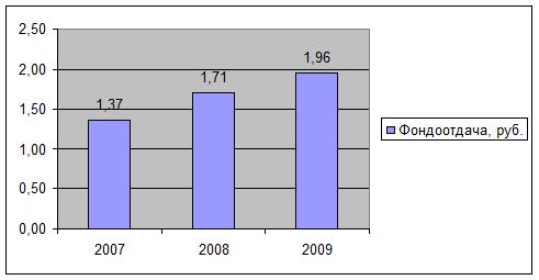 Данные таблицы позволяют отметить, что происходит рост таких показателей как фондоотдача и рентабельность использования основных фондов. Это означает, что деятельности кафе «Жемчужина» организована таким образом, что имеющие основные фонды используются все эффективнее. Об этом говорит рост показателя фондоотдачи с 1,37 руб. до 1,96 руб. Также имеется положительная динамика рентабельности с 76,65% до 84,75%. Динамику показателя фондоотдачи покажем на рис. 2.4.