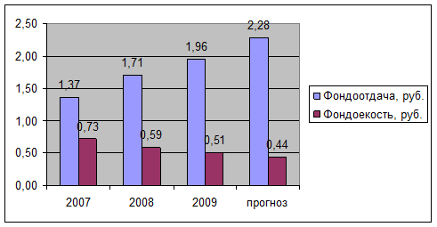 Представленные данные показывают, что изменение стоимости и доли активной части основных фондов, привело к тому, что увеличивается выручка, прибыль, рентабельность использования основных фондов и фондоотдача. Снижение фондоемкости показывает, что для изготовления продукции требуется уже меньшая сумма основных средств. Покажем, как изменяется фондоотдача и фондоемкость на рис. 3.1.