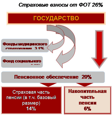 Рис. 1 Схема формирования пенсионных накоплений В 2010 году размер страховых взносов, перечисляемых работодателем остался на уровне, установленном в 2009 году, 26% от фонда оплаты труда. Тариф страховых взносов на 2011 год во внебюджетные фонды установлен в размере 34%.Статьями 12 и 57 Закона № 212-ФЗ установлены размеры страховых взносов, перечисленные в таблице 2.2 Табл. 1.1 Тарифы страховых вносов во внебюджетные фонды в 2010-2011 гг.[9]