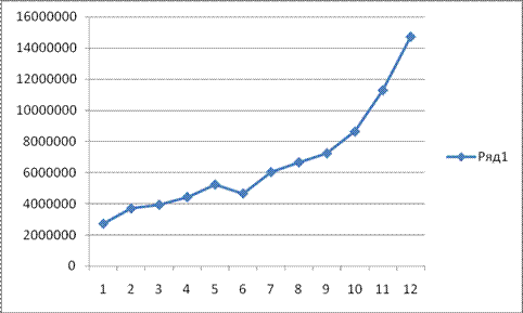 На основании данных, представленных в данной таблице, можно сделать вывод о том, организация находится в состоянии подъема. Наблюдается динамика развития, показатели роста доходов и расходов пропорциональны, резкий скачок показателей между 2006 и 2007 годами объясняется открытием 3-х филиалов, однако необходимо такой фактор как инфляцию в условиях рынка. Далее, для осуществления анализа деятельности целесообразно в графической форме отобразить динамику продаж ООО «Ультрапак», которая имеет сезонный характер, что связано с характерным спадом в январе и пиком продаж в декабре перед новым годом, а также с периодичностью закупок производителей кондитерских изделий, салатных цехов и мясокомбинатов и т.д.