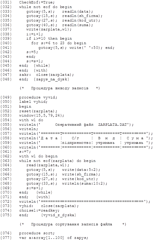 де j - кількість записів, що мають різне значення показника "код с/г підприємства". Відомість розподілу оплати праці за видами сільськогосподарських робіт використовується для аналізу й контролю утримань з сум заробітку, для складання статистичної звітності по праці, для складання бухгалтерських проводок та ін. Ця відомість є основою для розрахунків з бюджетом за підсумками‚ утриманими із заробітної плати робітників і службовців‚ і інших платежів до бюджету‚ іншим організаціям та окремим фізичним особам. Вихідне зведення "Відомість розподілу оплати праці за видами сільськогосподарських робіт" формується на основі даних вхідного файлу ZARPLATA.DAT, просортованого по виду оплати і отриманого таким чином файлу SZARPLATA.DAT. Сортування вхідних даних здійснюється процедурою SORT, формування та вивід зведення на дисплей здійснюється процедурою DRUK_VIDOM. 2 . Практична частина 2.1 Архітектура програмиПоставлена задача реалізується програмою KURS. Програма складається з головного блоку та чотирьох процедур: - VVID; - VYVID; - SORT; - ZVEDENNYA. Запуск програми здійснюється двома способами: -з головного меню інтегрованого середовища TurboPascal шляхом вибору опції Run (попередньо програма повинна бути завантажена в ОП - F10, File, Open, KURS.PAS); -із середовища операційної оболонки NortonCommander шляхом запуску KURS.EXE (попередньо програма повинна буди відкомпільована з опцією Destination To Memory). Програма виводить на дисплей головного меню, котре пропонує користувачеві вибір однієї з опцій: - запис даних на диск; - вивід файлу на дисплей; - сортування записів вхідного файлу; - вивід зведення на дисплей; - завершення роботи. При виборі певної опції викликається відповідна процедура програми. Завершення роботи програми й повернення в середовище системи програмування Turbo Pascal здійснюється при натисканні клавіші Esc, або при виборі опції "Завершення роботи". Програма формує на жорсткому диску файл послідовного доступу ZARPLATA.DAT, сортує записи цього файлу з без утворення нового дискового файлу і на основі даних файлу ZARPLATA.DAT формує та виводить на екран дисплею відомість утримань і внесків з оплати праці. Наведемо опис процедур програми KURS.PAS. Процедура VVID. Призначення - ввід даних з первинних документів і запис їх на диск у файл ZARPLATA.DAT. Процедура викликається з головного меню програми при виборі пункту "Запис даних на диск" (функціональна клавіша F2). Процедура виводить на дисплей екранну форму для вводу даних з первинних документів. Ввід даних здійснюється в такій послідовності: - місяць; - код сільськогосподарського підприємства; - шифр виробничих затрат; - вид утримань; - сума утримань. Після вводу запису користувачеві пропонується продовжити ввід даних, натиснувши клавішу Enter, або завершити ввід, натиснувши клавішу Esc. В останньому випадку процедура припиняє роботу і повертає керування в програму. Процедура VYVID. Призначення - читання вхідних даних з дискового файлу ZARPLATA.DAT та вивід їх на дисплей. Процедура викликається з головного меню програми при виборі пункту "Вивід файлу на дисплей" (функціональна клавіша F3). При ініціалізації процедури на екран виводиться екранна форма і відкривається вхідний файл ZARPLATA.DAT для читання. Записи файлу зчитуються з диска один за одним і виводяться на дисплей (див. додаток 5). Процедура завершує роботу при досягненні кінця файлу ZARPLATA.DAT і передає керування в програму. Проце