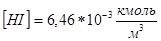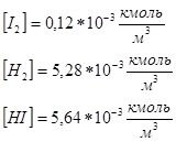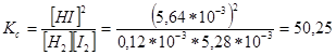 Для определения величины константы равновесия необходимо определить состав равновесной газовой смеси. H2 и I2 реагируют с образованием HI, то в равновесной смеси исходное кол-во будет меньше, чем в исходной. Исходная концентрация H2 и I2 :