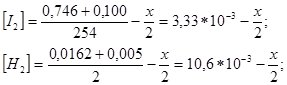 При добавлении к исх. смеси 0,100кг I2 и 0,005 кг H2 установ. равнов., но Кс не изменится. Обозначим новую равновесную конц.[HI]=x, тогда равнов. конц. [I2 ] и [H2 ] будут равны: