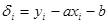 вероятность попадания в интервал разбиения с номером i , mi – число значений функции в интервале разбиения, m, σ – математическое ожидание и с.к.о. случайной величины X , Φ* – интеграл вероятностей. Чтобы определить функциональную зависимость между величинами по результатам наблюдений, используем метод наименьших квадратов (МНК): Пусть из опыта получены точки: x1, y1, xn, yn Требуется найти уравнение прямой y=ax+b (15), наилучшим образом согласующейся с опытными точками. Пусть мы нашли такую прямую. Обозначим через δi расстояние опытной точки от этой прямой (измеренное параллельно оси y). Из уравнения (15) следует, что: