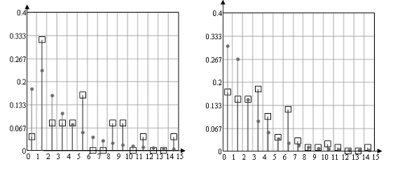 На полигоне частот (рисунок 11) показаны значения частоты распределения чисел по интервалам и вероятностей попадания в эти интервалы. Теоретическое значение критического значения критерия Пирсона при уровне значимости α=0.1 и числом степеней свободы r=m-1 рассчитаем по формуле (11).