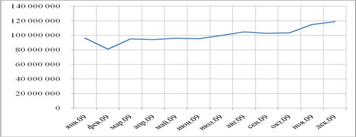 Рисунок 6. Соотношение проблемных займов к ссудному портфелю По нашему мнению уровень проблемных активов банка в этом году останется на уровне последних месяцев и, учитывая фактическое увеличение объемов кредитования в конце прошлого года и улучшения кредитоспособности населения по мере восстановления экономики страны, можно ожидать плавного снижения данного показателя в последующих периодах. Также ожидается, что в 2010 году соотношение проблемных активов к ссудному портфелю окажется на уровне 6–7% (см рисунок 6). Основная статья обязательств банка состоит из клиентских вкладов и долговых ценных бумаг. Депозиты клиентов. В 2009 году банк показал существенный прирост клиентских вкладов, который на 1 января достиг почти 50%. Данное увеличение имеет прямое отношение к росту объема кредитования, Мы ожидаем, что данное значение достигло пика и будет плавно снижаться в следующих периодах (см. Рисунок 7). По нашим прогнозам существенный рост депозитов не приведет к избытку ликвидности, поскольку увеличение ссудного портфеля оказалось соизмеримо с приростом клиентских вкладов.