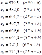 * -расчетные значения (без индекса отчетные данные за предыдущие годы) Ки =1 -коэффициент изменения приведенных затрат с момента tt ; Мпр = 670,0 тыс.н-час - проектная производственная мощность (пропускная способность); Smax =180 - максимально возможное число единиц оборудования в цехе; F= 4015 часов для двухсменного режима работы - годовой действительный (эффективный) фонд времени работы единицы оборудования за год. 1.2. Построение линии регрессии Для построения линии регрессии воспользуемся методом «Средних». Рассчитаем значения отклонений ei экспериментальных значений от линии регрессии для системы уравнений, используя формулу ei =V(ti )-(a*t+b):