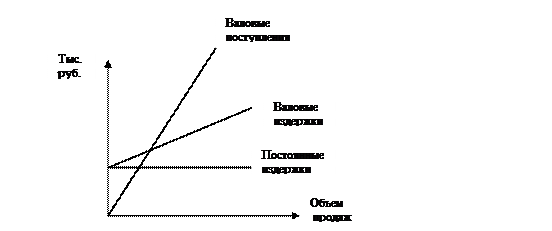 На таком графике представлены общие издержки и ожидаемые общие поступления при разных уровнях объема продаж. Независимо от объема сбыта постоянные издержки находятся на одном уровне. Валовые издержки как сумма постоянных и переменных издержек растут одновременно с ростом сбыта. Крутизна наклона кривой валовых поступлений зависит от цены товара. После преодоления точки безубыточности (пересечение кривой валовых поступлений с кривой валовых издержек) фирма начнет получать целевую прибыль.