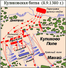 Рис. 1 [2] Взошло солнце и разогнало туман. Вдали показались полчища Мамая. По обычаю бой начался поединком. Русский воин Пересвет и татарин Челубей, встретившись на быстрых конях, пронзили друг друга копьями и оба пали мертвыми. Татары сплошной лавиной обрушились на передний полк. Русские приняли бой, не дрогнув. Вскоре передний полк был уничтожен. Масса пеших и конных татар врезалась в большой полк, которым руководил князь Дмитрий. Татарская конница ударила по левому флангу русских войск. Полк левой руки стал отходить. Татары прорвались в тыл большого полка. В это время конный засадный полк под командой серпуховского князя Владимира и волынского воеводы Дмитрия Боброка вихрем налетел на врага. Ужас охватил татар. Им казалось, что на них напали огромные свежие силы. Конница Мамая обратилась в бегство и смяла свою пехоту. Мамай наблюдал за ходом боя с высокого холма. Увидев поражение своих войск, он бросил богатый шатер и ускакал. Русские преследовали врага до реки Красивая Меча. Звоном колоколов и всеобщим ликованием встретила Москва победителей. За славную победу народ прозвал князя Дмитрия - Дмитрием Донским. Куликовская битва имела большое значение. Русский народ понял, что объединенными силами можно добиться победы над иноземными завоевателями. Еще выше поднялся авторитет Москвы как центра освободительного движения. Ускорился процесс объединения русских земель вокруг Москвы. Мнение: Куликовская битва и ее победа дала моральный настрой уже потерявшим веру в свои силы русскому народу и по моему мнению настроила на дальнейшие победы. 7. Освобождение от монголо-татарского ига После присоединения Новгородской земли Московское княжество превратилось в большое и сильное государство. К этому времени Золотая Орда распалась. От нее отделились Казанское, Астраханское, Крымское и Сибирское ханства, жившие в постоянной вражде между собой. Заключив союз с крымским ханом Менгли-Гиреем, Иван III начал готовиться к разрыву с Ордой. В 1478 году Иван III в присутствии московских бояр и ордынских послов разорвал и растоптал договор с Ордой, заявив, что больше не будет подчиняться хану и платить дань. Ханских послов выгнали из Москвы. Золотоордынский хан Ахмат решил воевать с непокорной Москвой. Летом 1480 года он с большим войском подошел к реке Угре, впадавшей в Оку недалеко от Калуги. Польско-литовский король Казимир IV, недовольный тем, что не удалось овладеть Новгородом, обещал помочь Ахмату и стал тоже готовиться к походу на Москву. Иван III поставил свои полки на противоположном берегу Угры, преградив татарам путь к Москве. Много раз татарские всадники пытались переправиться через реку, но русские встречали их дождем стрел и огнем пушек. Четыре дня продолжался бой на Угре. Потеряв изрядное число своих воинов, Ахмат отказался от переправы. Шли недели, месяцы, а Ахмат все ждал помощи от поляков. Но Казимиру IV было не до него. На южные земли Польско-Литовского государства напал крымский хан Гирей, союзник Ивана III. Ахмат получил известие, что отряды русских, посланные на судах по Волге Иваном III, напали на территорию Золотой Орды. Наступил ноябрь. Начались морозы. Одетые по-летнему татары стали сильно страдать от холода. Ахмат ушел со своим войском на Волгу. Вскоре он был убит своими соперниками. Так, объединение русских земель в единое централизо