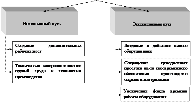 Рисунок 2. – Пути эффективного использования основных фондов и производственной мощности Улучшение использования основных фондов означает также ускорение их оборачиваемости, что в значительной мере способствует решению проблемы сокращения разрыва в сроках физического и морального износа, ускорения темпов обновления основных фондов. Наконец, эффективное использование основных фондов тесно связано и с другой ключевой задачей – повышением качества выпускаемой продукции, так как в условиях рыночной конкуренции быстрее реализуется и пользуется спросом высококачественная продукция. Успешное функционирование основных фондов и производственных мощностей зависит от того, насколько полно реализуются экстенсивные и интенсивные факторы улучшения их использования. Экстенсивное улучшение использования основных фондов и производственных мощностей предполагает, что, с одной стороны, будет увеличено время работы действующего оборудования в календарный период, а с другой – повышен удельный вес действующего оборудования в составе всего оборудования, имеющегося на предприятии.