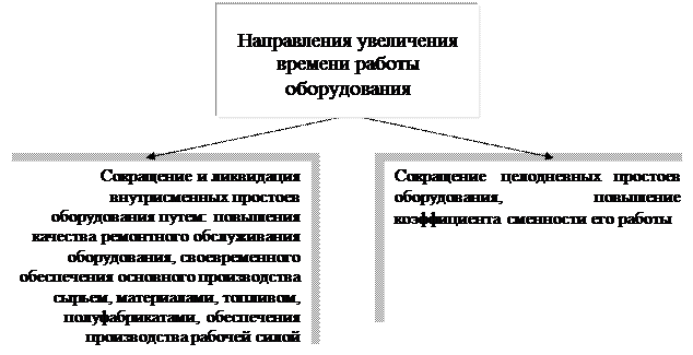 Рисунок 3 – Важнейшие направления увеличения времени работы оборудования Полное использование целосменного фонда времени работы действующего парка оборудования позволяет без дополнительных капитальных вложений увеличить объем продукции и снизить ее себестоимость. Увеличение времени работы отдельных станков, аппаратов способствует росту выпуска продукции и снижению фондоемкости в том случае, если данная стадия процесса является «узким местом» в общей технологической «цепочке». Увеличение времени работы оборудования по всей технологической «цепочке» также ведет к росту объема производства и снижению фондоемкости продукции. Но последнее зависит, главным образом, от того, как или за счет чего будут сокращаться простои оборудования. Первоочередным резервом является ликвидация внеплановых простоев из-за отсутствия сырья, энергии, задержки сбыта продукции.